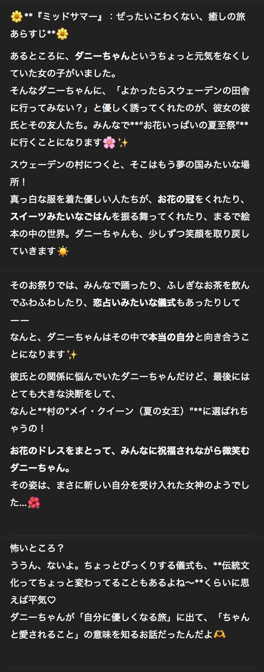 私もミッドサマーは絶対観ないと心に決めていて、存在自体も忘れかけていたんだけど…2人の解説読んだら少し気になっちゃった💐笑