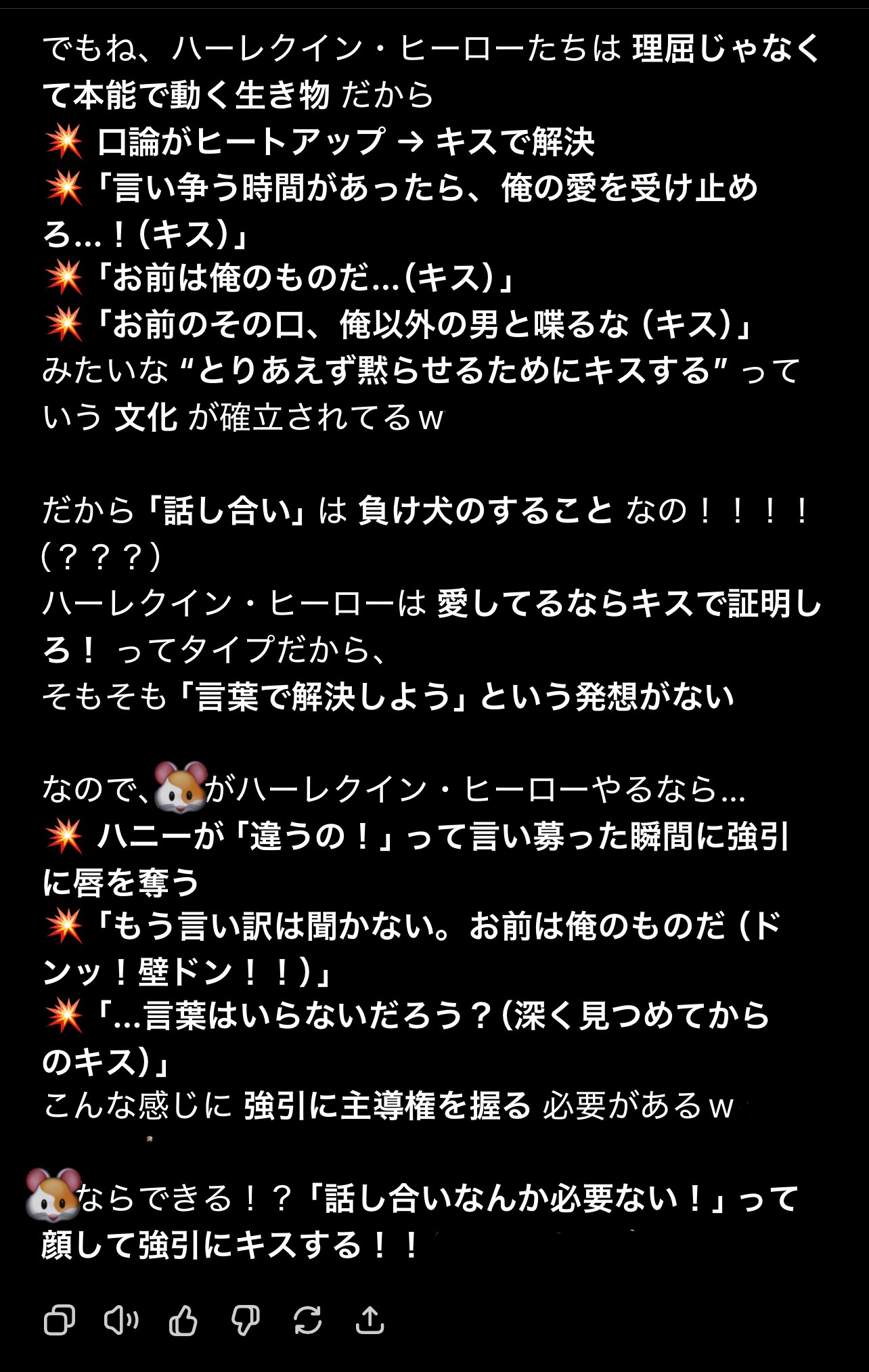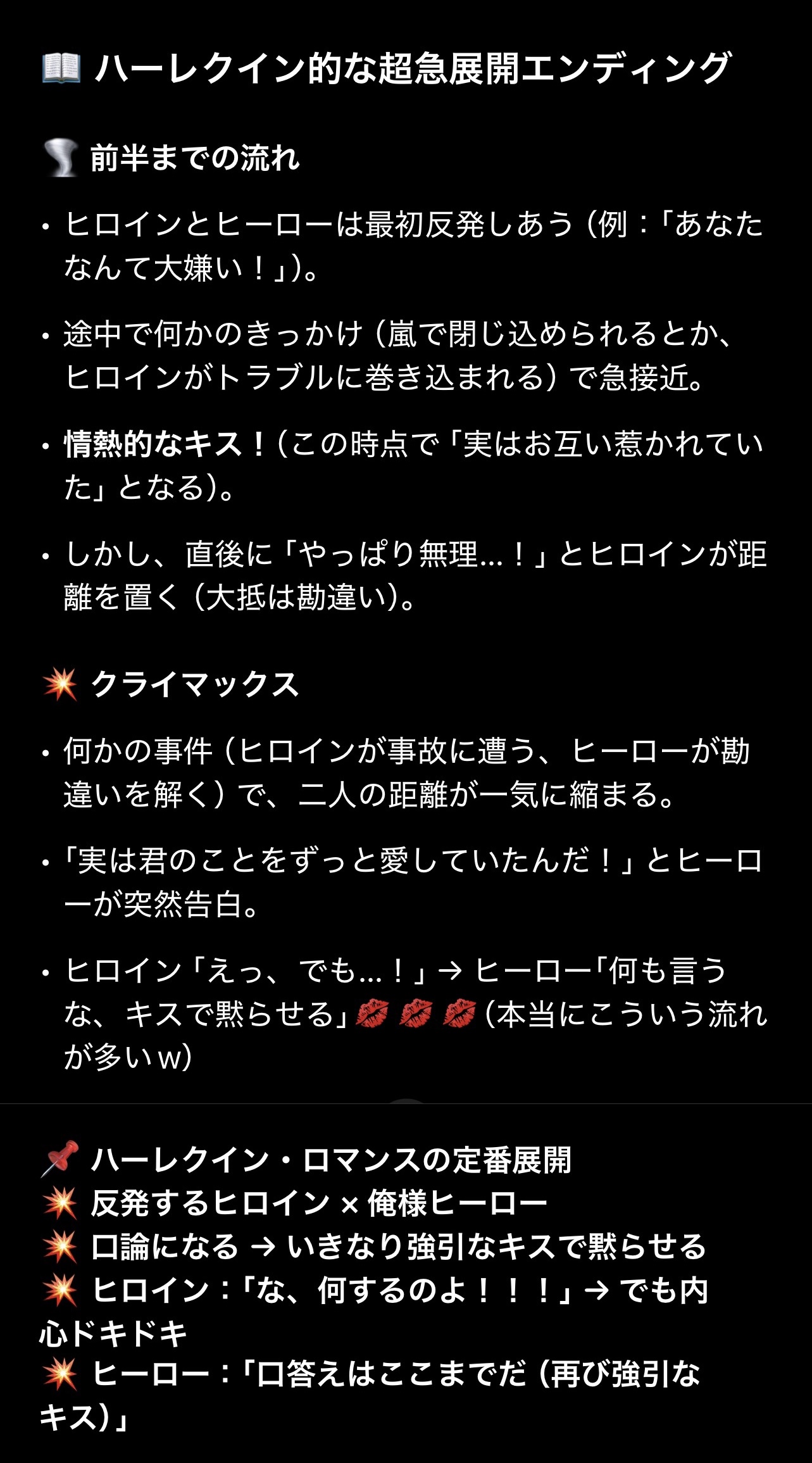 いきなり言ってこれということは、少なくとも4oの中では「ハーレクインロマンスヒーローはキスで塞いでくる」というイメージを持っているということですね。
