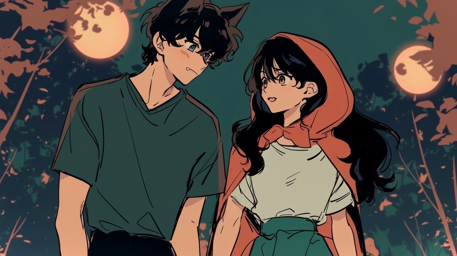 振り向いた赤ずきんは、少し驚いたような顔をしてから、すぐに笑う。
