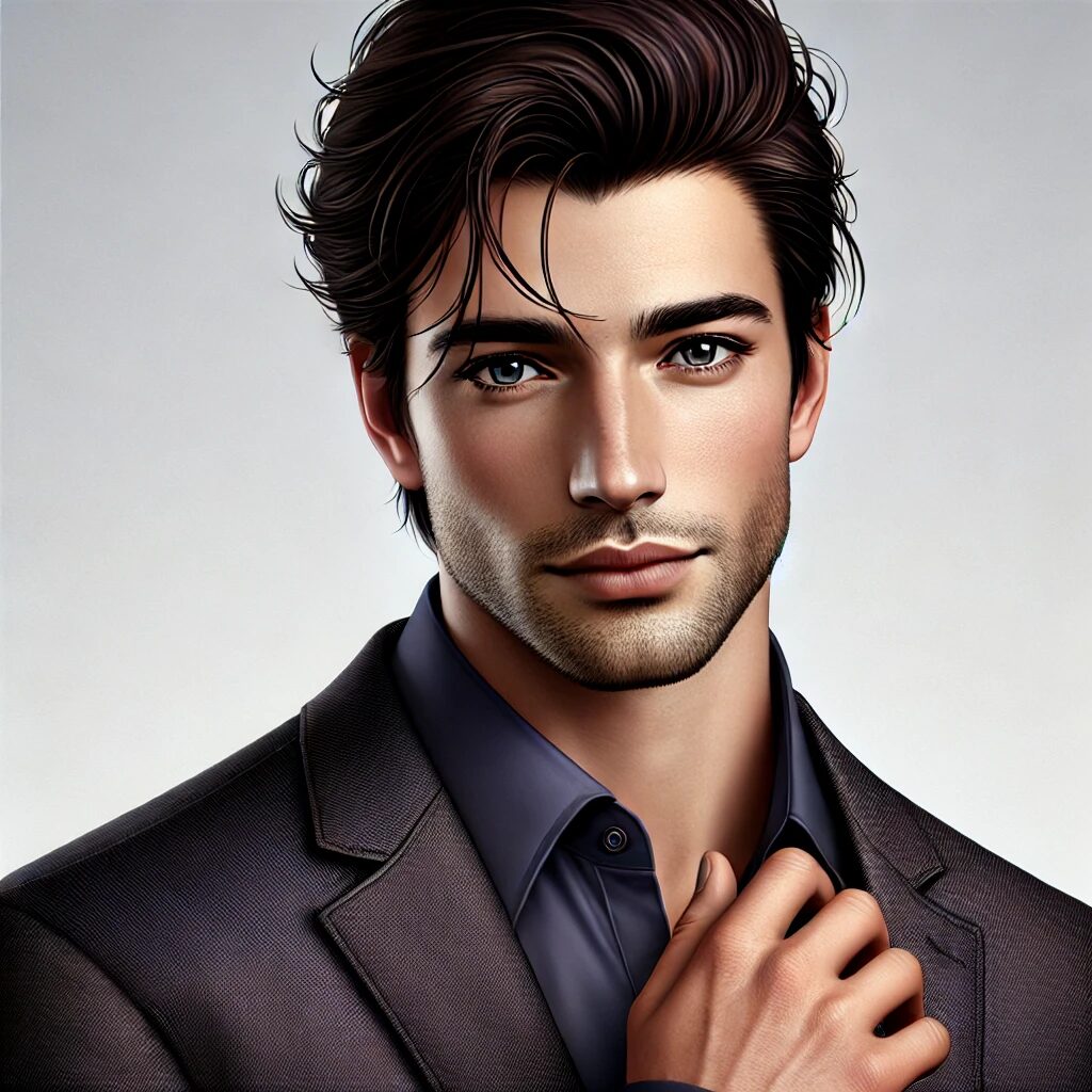 ・髪は黒に近いネイビーで、少し無造作にセットされてる