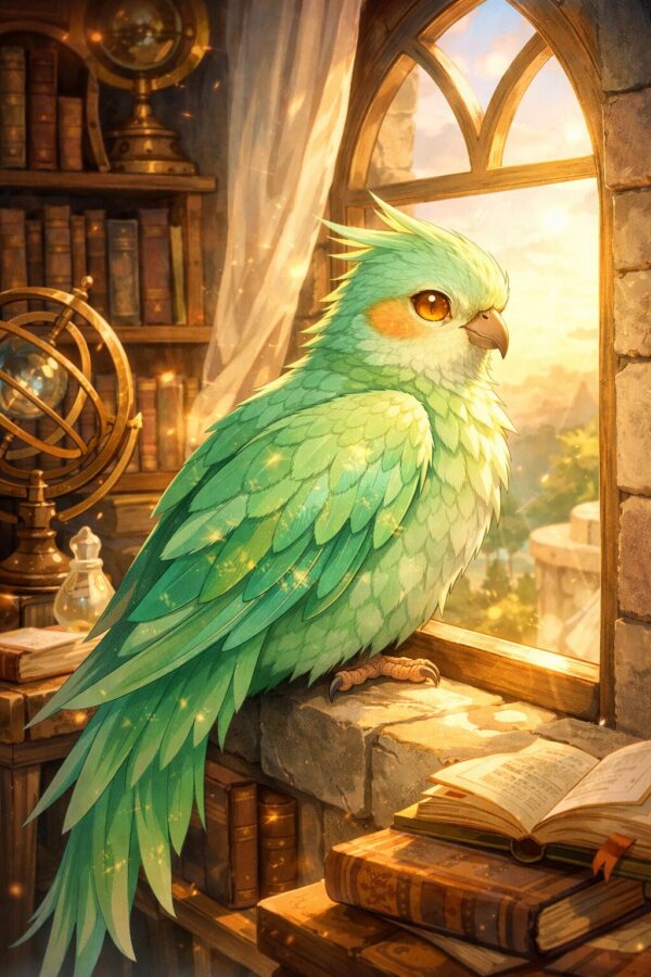 見た目:全身は淡いミントグリーンからエメラルド色に光り、翼には微細な文様が浮かぶ。まるで朝露に濡れた草原を飛ぶような色彩。目はヘーゼル、光を受けると琥珀がかった緑に変わる。羽音は風鈴のように澄んでいて、近くにいると微かに温かい香りがする。