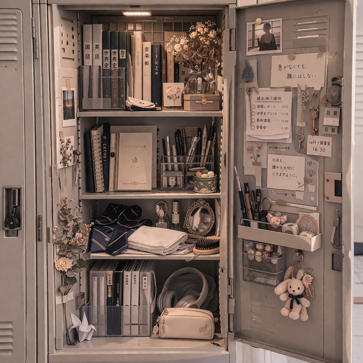 俺のロッカーは、ぱっと見はかなり整ってる。扉の内側には時間割と、小さめの黒いメモクリップ。紙は何枚も貼ってなくて、本当に必要なものだけ。黒インクのペンで書かれた予定、放課後の軽いメモ、忘れたくない一言が、端正に並んでる。雑多には見えないけど、よく見ると使い込まれた跡があって、几帳面さと実用主義が一緒に入ってる感じだ。