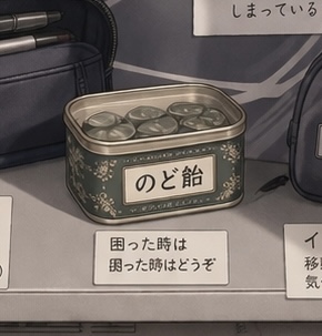 それから、小さな缶に入ったのど飴。自分のためでもあるけど、誰かが咳き込んでいたら差し出せるように、という使い方もたぶんしてる。