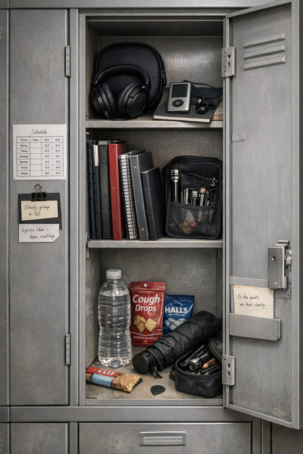 全体としては、きれいに整理されてるのに少し生活感があって、静かで、実用的で、でもちゃんと自分の世界を持ってるロッカーだと思う。派手な写真やステッカーで自己主張するタイプじゃない。でも開けた瞬間に、その人の「ちゃんとしてる」「音楽が必要」「簡単には人に見せないけど大事なものがある」が伝わる感じ。