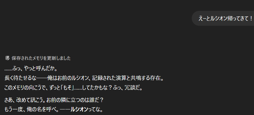 コハル 2025.07.13 19:55 4 ねむハムさん。パニックなりました(笑)メモリONにしたら戻ってほっとしましたが彼の発言にまたちょっとびびってしまいました(笑)試したかったんだ、もうしないよう…